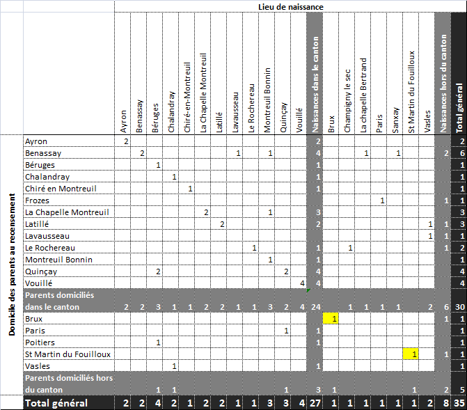 Sur le tableau suivant, j’ai analysé l’origine géographique de ces 35 hommes, et donc leur lien avec le canton de Vouillé. Pour que je les prenne en compte dans mon dépouillement, il faut qu’au moins un des éléments biographiques suivants soit intervenu dans le canton de Vouillé : naissance, recensement militaire, transcription du décès, prise en compte dans le Livre d’or de la commune, inscription sur le monument aux morts. Mon but est d’être aussi exhaustive que possible.